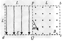 如图所示,虚线框abcd内为边长均为L的正形匀强电场和匀强磁场区域,电场强度的大小为E,方向向下,磁感应强度为B,方向垂直纸面向外,PQ为其分界线,现有一群质量为m,电荷量为-e的电子(重力不计)从PQ中点与PQ成30°角以不同的初速射入磁场,求:
