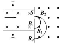 如图所示,沿直线通过速度选择器的正离子从狭缝S射入磁感应强度为B2的匀强磁场中,偏转后出现的轨迹半径之比为R1∶R2=1∶2,则下列说法正确的是( )