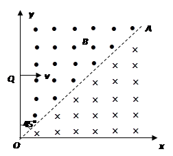 如图所示,xOy坐标系的第一象限内,有一边界线OA与y轴的夹角∠AOy=45O,边界线的上方与下方分别存在垂直纸面向外与向里的匀强磁场,磁感应强度大小均为B=0.25T.一束带电量q=8.0×10-19C、质量 m=8.0×10-26kg的正离子以v=5×105m/s从y轴上坐标为(0,0.4m)的Q点垂直y轴射入磁场区。求: