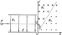 如图所示,水平放置的两平行金属板间存在相互垂直的匀强磁场和匀强电场,磁场的磁感应强度为B1,方向与纸面垂直,电场的场强E=2.0×105V/m,方向竖直向下,PQ为板间中线.紧靠平行板右侧边缘建立平面直角坐标系xOy,在第一象限内,存在着以AO为理想边界的两个匀强磁场区域,方向如图所示,磁感应强度B2=B3=0.6T,AO和y轴间的夹角θ=30°.一束带负电的粒子,质量不同,带电量q=2.5×10-8C,以v=5×105m/s的水平速度从P点射入板间,沿PQ做直线运动,穿出平行板区域后从y轴上坐标为(0,0.3m)的Q点垂直于y轴射入磁场区域.(粒子的重力不计)