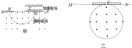 甲图为质谱仪的原理图.带正电粒子从静止开始经过电势差为U的电场加速后,从G点垂直于MN进入偏转磁场.该偏转磁场是一个以直线MN为上边界、方向垂直于纸面向外的匀强磁场,磁场的磁感应强度为B,带电粒子经偏转磁场后,最终到达照相底片上的H点.测得G、H间的距离为d,粒子的重力忽略不计.