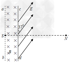 如图所示,真空室内存在宽度为d=8cm的匀强磁场区域,磁感应强度B=0.332T,磁场方向垂直于纸面向里;ab、cd足够长,cd为厚度不计的金箔,金箔右侧有一匀强电场区域,电场强度E=3.32×105N/C;方向与金箔成37°角。紧挨边界ab放一点状α粒子放射源S,可沿纸面向各个方向均匀放射初速率相同的α粒子,已知:α粒子的质量m=6.64×10-27 kg,电荷量q = 3.2×10-19 C,初速度v = 3.2×106m/s。(sin37°= 0.6,cos37°= 0.8)求: