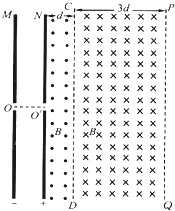 如图所示,MN为两平行金属板,O、O为两金属板中心处正对的两个小孔,N板的右侧空间有磁感应强度大小均为B且方向相反的两匀强磁场区,图中N板与虚线CD、PQ为两磁场边界线,三条界线平行,两磁场区域的宽度分别为d和3d,沿边界线方向磁场区域足够大.在两金属板上加上大小可调节的直流电压,质量为m、电量为-q的带电粒子(重力不计);从O点由静止释放,经过MN板间的电场加速后,从O'沿垂直于磁场方向射入磁场,若粒子能穿过CD界并进入CD右侧磁场但不能穿过PQ界,最终打到N板而结束运动,试求: