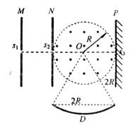 ,s1、s2、O三点共线,它们的连线垂直M、N,且s2O=R..以O为圆心、R为半径的圆形区域内同时存在磁感应强度为B、方向垂直纸面向外的匀强磁场和电场强度为E的匀强电场.D为收集板,板上各点到O点的距离以及板两端点的距离都为2R,板两端点的连线垂直M、N板。质量为m、电荷量为+q的粒子,经s1进入M、N间的电场后,通过s2进入电磁场区域,然后沿直线打到光屏P上的s3点.粒子在s1处的速度和粒子所受的重力均不计.求: